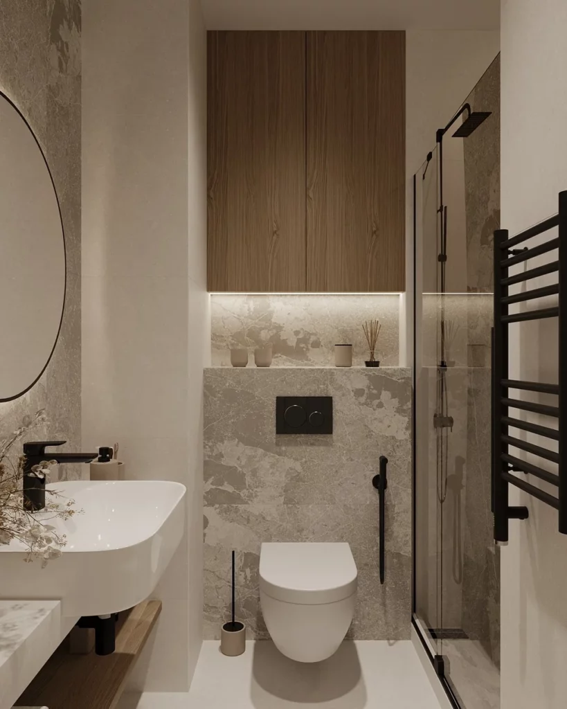 • widoki ścian w łazienkach i WC.